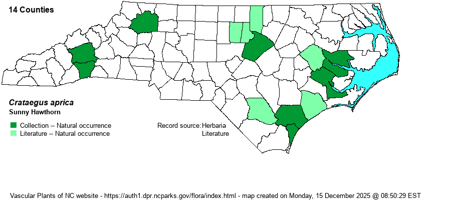 | Distribution | Poorly known, but scattered over parts of the Coastal Plain, Piedmont, and Mountains, according to Weakley (2018). However, Lance (2014) has a completely different range, that being in the Mountains from about Buncombe County south to SC, and also near the Fall Line north to about Wake and Johnston counties. Obviously, these two authors have different criteria as to what constitutes this species. The range map below is certainly incomplete, not only for this species but for nearly all Crataegus species, owing to major taxonomic issues for most members of this large genus.