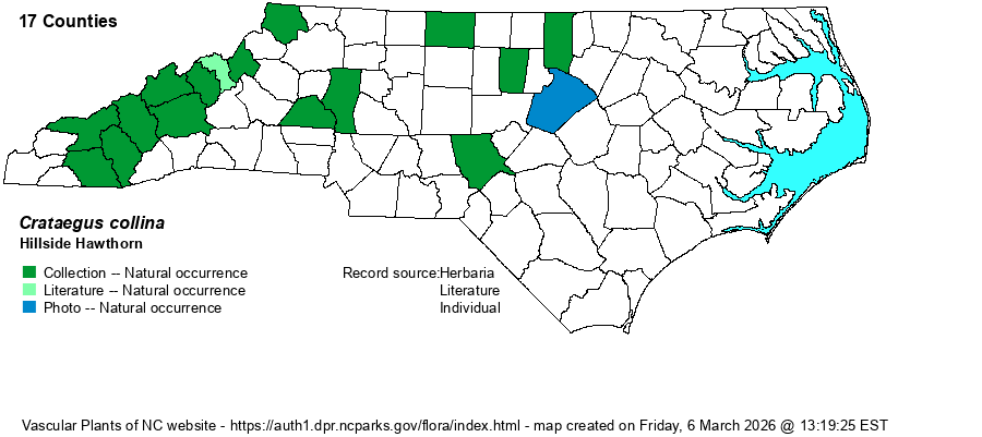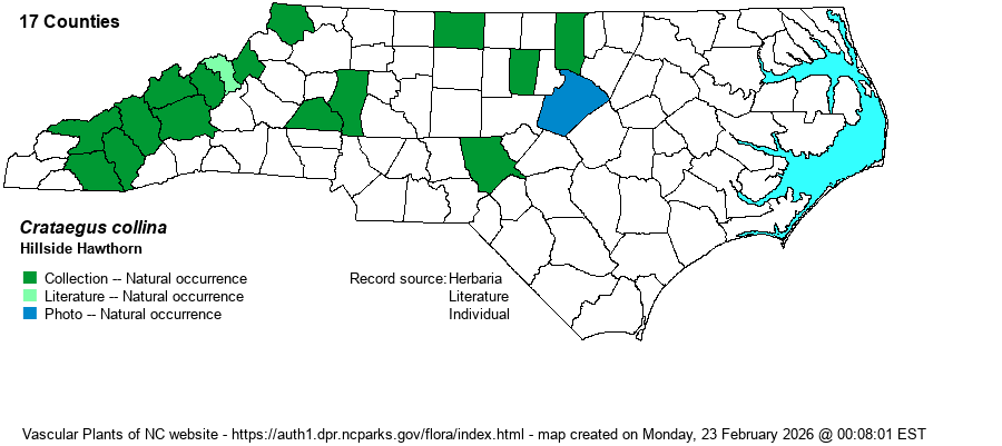 | Abundance | Poorly known in the state, apparently not scarce, but obviously not well known. Perhaps infrequent to fairly common in the Mountains and much of the Piedmont. Weakley's (2018) map shows it as "uncommon" in both the mountains and the Piedmont. This website has therefore assigned a tentative state rank of S4?. (Note that most of the state ranks for Crataegus species have not been assigned by the NC NHP; and those with a global rank of GNR are considered as species by NatureServe but no Global Rank has yet to be assigned. | |