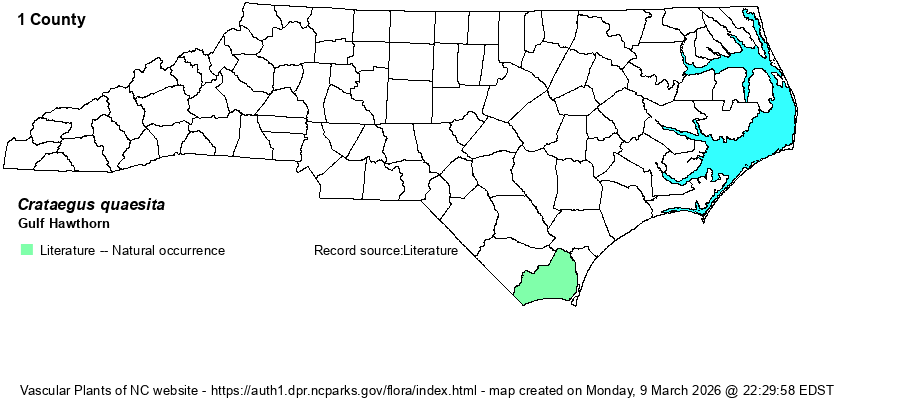 | Identification | This is a large shrub to perhaps a small tree, with often long and drooping branches. The leaves often have long petioles, and the leaf bases are also strongly and narrowly cuneate. The outer half of the leaves tend to be strongly serrated, often into three lobes. (There are several varieties, and thus generalizations can be tricky.) The central (middle) lobe often is quite pointed/acute, and thus the leaves are not at all fan-shaped like many other hawthorns with strongly cuneate bases. As this species is so poorly known in NC, and may be limited to just Brunswick and perhaps a few adjacent counties, biologists will almost certainly need to grab a twig of an unknown hawthorn to key out, just in case it is this species. Any records should be documented. | |