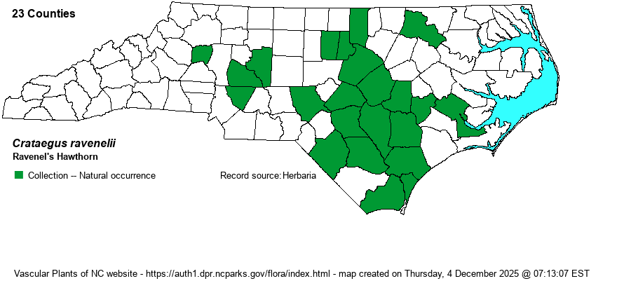 | Distribution | Occurs over the Coastal Plain and Piedmont to an undetermined extent, though seemingly more widespread in the southern Coastal Plain than elsewhere. Details of the range are not well known. In fact, owing to an unsettled taxonomy, no herbarium contains NC specimens under the name of Crataegus ravenelii yet. However, it appears that the majority of the Coastal Plain and Piedmont records of the former C. flava, which has been split up into a handful of species, now refer to this species (and not yet split out by most herbaria). Coding nearly all former C. flava records for these two provinces as the "new" C. ravenelii is certainly dangerous, but even if some of the counties on the map presumably do not refer to C. ravenelii, the website editors do not want to toss out nearly all records of C. flava, especially in the Piedmont. However, the range map below should be generally correct.