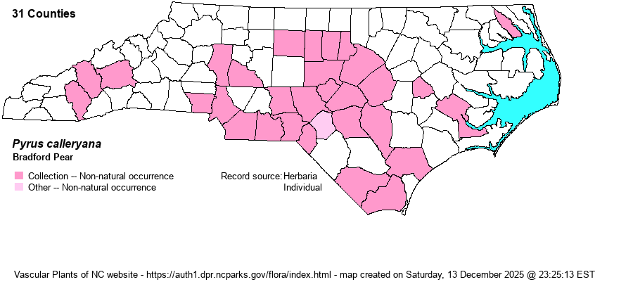 | Abundance | Frequent to locally very common, rapidly becoming abundant in the central portions of the state. Cultivation in NC began in the 1970s (1960s?), with the first report of escapes in 1984 in Orange County. Rapidly expanding the range since 2000. Bradford Pear is glorious in flower and in fall color, but fertile cultivars are now invading and will be difficult to control. For a fascinating account of its spread, see Vincent (2005). | |