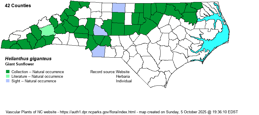 Identification | True to its name, Giant Sunflower grows 3-9 feet tall, with a coarsely hairy stem, lance-shaped leaves that reach 7 inches long and are rough on the upper surface and that have very short stalks. The leaves are mostly alternate on the stem, a good field character, as most other sunflowers have opposite leaves. The disks and rays are yellow, but in this species the rays are often light yellow to canary yellow, a character from a long distance that can quickly identify this most striking species when in bloom. H. schweinitzii is also tall (to 9 feet) but differs in its green stems (vs. reddish), opposite leaves, revolute-margined leaves (vs. not curled under), and typically goldenrod yellow ray color (versus medium yellow to pale yellow). | |