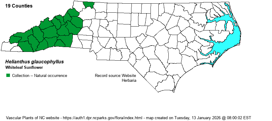| Identification | Plants generally grow 3-6 feet tall, with smooth and usually glaucous stems. Leaves are lance-shaped or lance-ovate, toothed, smooth to roughish above, smooth and glaucous beneath, 3-7 inches long. The heads are relatively small, with yellow disks and only 5-8 yellow rays. The small size of the heads recalls H. microcephalus, but that species has green and rather hairy undersides of leaves. Normally, to identify the species, look at the underside of the leaf, and it should be whitish as opposed to light or medium green of similar species. At times, the whitish to very pale green leaf undersides can be easily seen from a moving vehicle along forest roads. | |