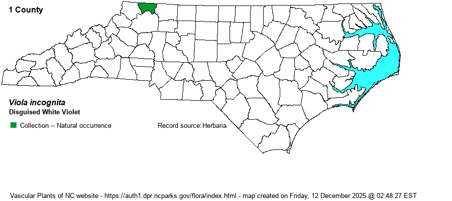 | Distribution | Very poorly known, owing to great similarly to and confusion with V. blanda, though believed to occur only in the Mountains. The SERNEC database (2024) lists collections from 7 counties. Moreover, in examining all violet specimens at NCU in July 2024, Harvey Ballard annotated none to V. incognita. A 1958 specimen from Alleghany County, annotated by Derek Poindexter in 2010, appears to be correct. It appears that this species might not currently occur in NC, at least for certain. The Digital Atlas of Virginia Flora shows records scattered in the Mountains south only to Bedford County, though admitting difficulties in identification with V. blanda.