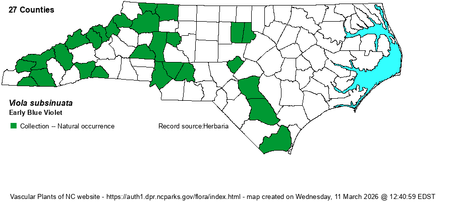 | Distribution | Scattered over the Mountains and much of the Piedmont, with gaps; details to be worked out. Also inner Coastal Plain, where rare. Specimens are essentially old ones that were collected with the assumption at the time that they were V. palmata. Our map reflects annotated specimns at NCU verified by Ballard in July 2024 and at SERNEC by Sorrie in Sept. 2024.