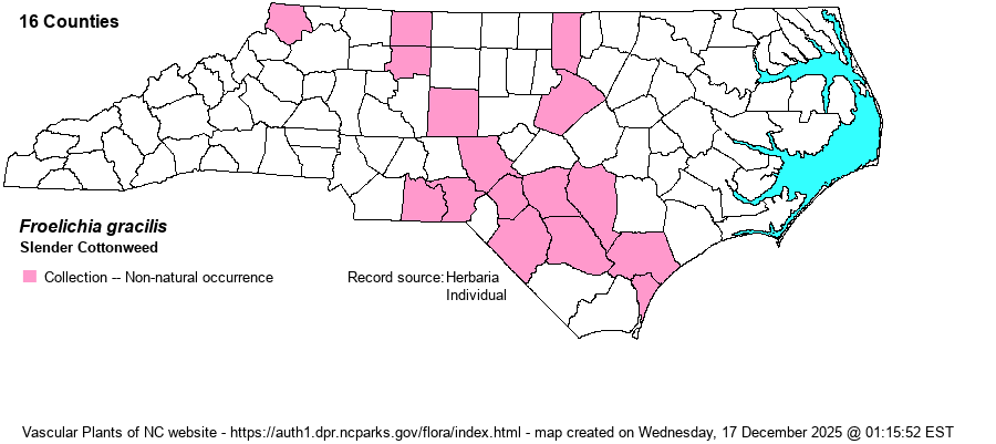 | Abundance | Infrequent in the Sandhills and southern Coastal Plain; rare in the Piedmont and Mountains, and elsewhere in the Coastal Plain. | |