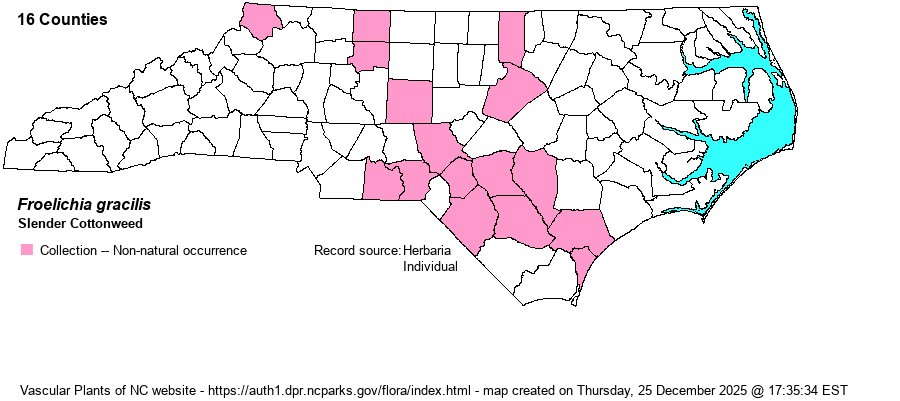 | Identification | Slender Cottonweed resembles the native-in-NC Florida Cottonweed (F. floridana), but is a shorter plant with widely spreading to ascending stems, branching from the base. Both species have very odd "papery-looking" narrow clusters of whitish flowers terminating branches and the main stem. | |