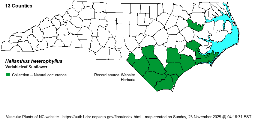 | Identification | With its well-developed basal leaves and small, sparse stem leaves, this sunflower looks "scapose" (leafless stem). Heads are few (1-3, maximum of 5) with yellow rays and red-purple or brownish disks. Some plants of Purpledisk Sunflower (H. atrorubens) may look similar, but it is a taller plant (2-5 or 6 feet tall vs. a maximum of 3 feet) and lower leaves are toothed on the margins (vs. smooth or nearly so). This is a characteristic sunflower of well-managed (with fire) pine savannas. | |