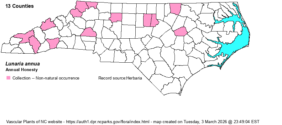 | Identification | This species is cultivated for its rosy, magenta, or white flowers and especially for the large, broadly elliptical, papery pods that are flattened such that the seeds can be easily seen. The flowers look quite a bit like those of Dame's Rocket (Hesperis matrionalis), but the fruits are very distinctive. | |