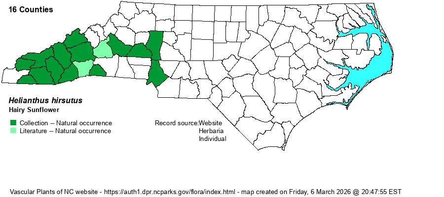 | Identification | Plants typically grow 2-5 (-6) feet tall from long rhizomes, the stems coarsely hairy throughout. Leaves are opposite, short-stalked, lance-shaped to ovate, up to 6 inches long and 3 inches wide, coarsely hairy on both sides (may be scabrous above). Rays and disks are yellow. Together, the long rhizomes (greater than 4 inches) and long hairy stems and leaves should clinch identification. The non-native (in NC) Ashy Sunflower (H. mollis) has soft-hairy leaves. At first glance, this species looks like the much more common H. divaricatus, but that species has a smooth stem as opposed to a clearly hairy stem. | |