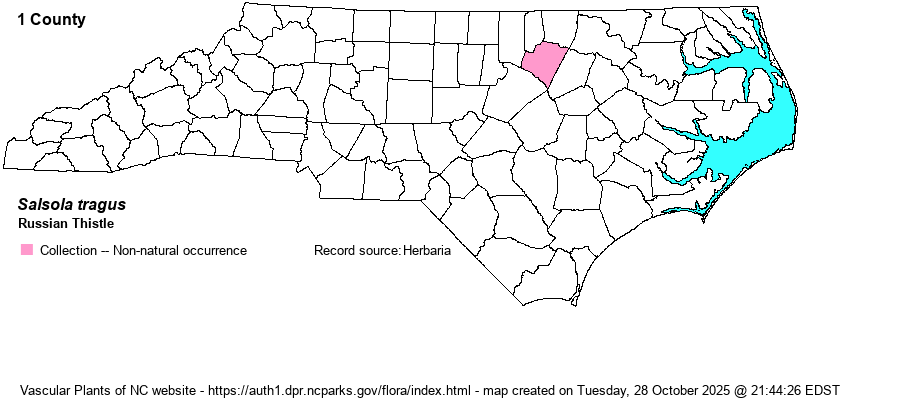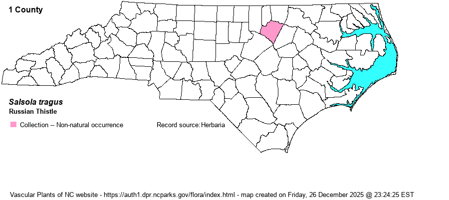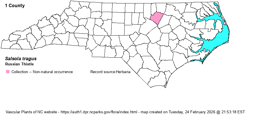 | Distribution | Formerly included within Salsola kali, but split out in FNA (2003) and other recent texts; however, Weakley (2024) does not include this entity by this name, and apparently he has moved it back into S. kali, of one variety or another. RAB (1968) indicate its presence in Franklin County; however, to date no verified specimens have been seen from NC.