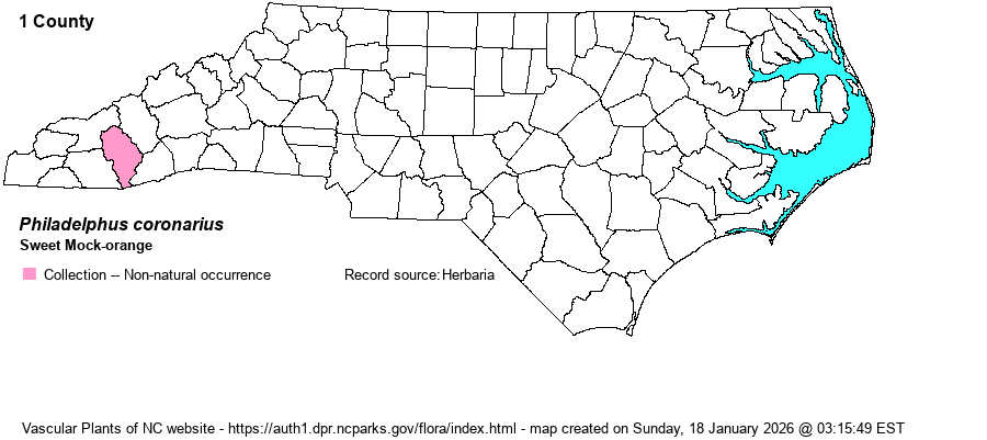 | Distribution | Of 4 collections from Jackson County at SERNEC, only 1 is accompanied by an image with label data; it was stated to be a waif from cultivation. BONAP maps it only in Jackson County. Other specimens from Forsyth, Mecklenburg, and Orange counties are of cultivated plants.
