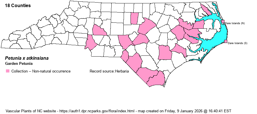 | Identification | The familiar Garden Petunia is sold abundantly in NC as a hanging or pot plant. The large red-purple to violet flowers are a favorite. | |