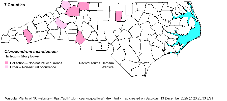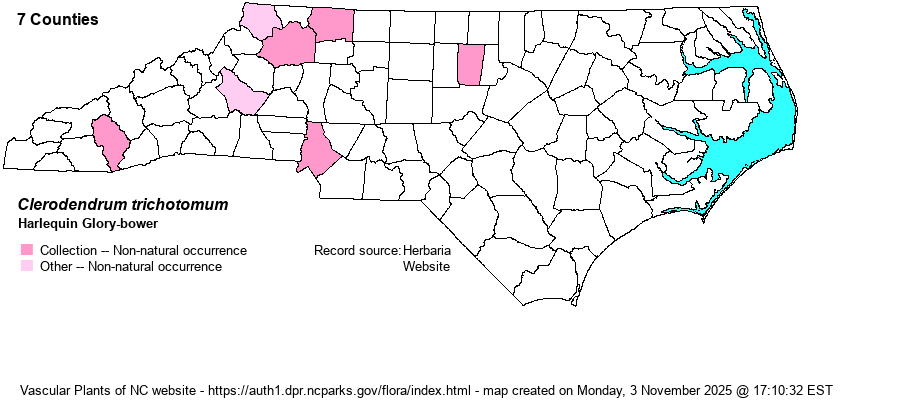 | Distribution | Mostly in the upper Piedmont and Mountains; also Mecklenburg and Orange counties in the Piedmont. First collected in 1931 in Orange County, "grounds back of Caldwell Hall", UNC Chapel Hill. The specimen from Alleghany County was actually collected in adjacent Surry County.