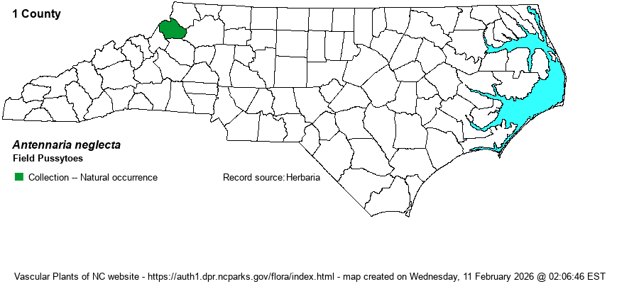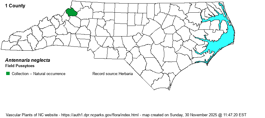 | Identification | The species looks very similar to Howell's Pussytoes (A. howellii) and is separated by technical characters. This species has: "Middle and upper cauline leaves tipped with flags; mature basal leaves glabrous, young basal leaves pubescent, glabrescent with age; species sexual, populations consisting of both pistillate and staminate plants" (Weakley 2024), versus A. howellii having "Middle and upper cauline leaves blunt or with subulate tips (only those leaves immediately around the corymb with flags); mature and young basal leaves pubescent; species apomictic, populations consisting of pistillate plants only" (Weakley 2024). Thus, look for single-veined basal leaves that are glabrous (when mature), versus leaves that are pubescent in A. howellii. | |