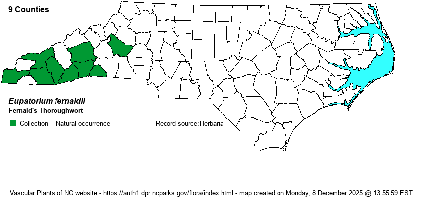 | Abundance | Until a specimen was collected (NCU specimen) in Cherokee County in 2022 by Mark and Myra Basinger, and confirmed by Bruce Sorrie, all previously known specimens seemed to be from 1969 and older, which is why the NCNHP had given a State Rank of SH (Historical), and tracks records as Significantly Rare. In 2024, that agency re-ranked the species as S1 owing to the recent record. However, based on collections from 9 counties as of 2025, the species probably merits a rank of S1? if not S2?; the editors suggest S1S2 for now. There is little reason for most Eupatorium species to have become very rare over time, owing to their ability to grow on wooded margins, which are abundant. NatureServe has not yet given a Global Rank, and the editors suggest G2?. | |