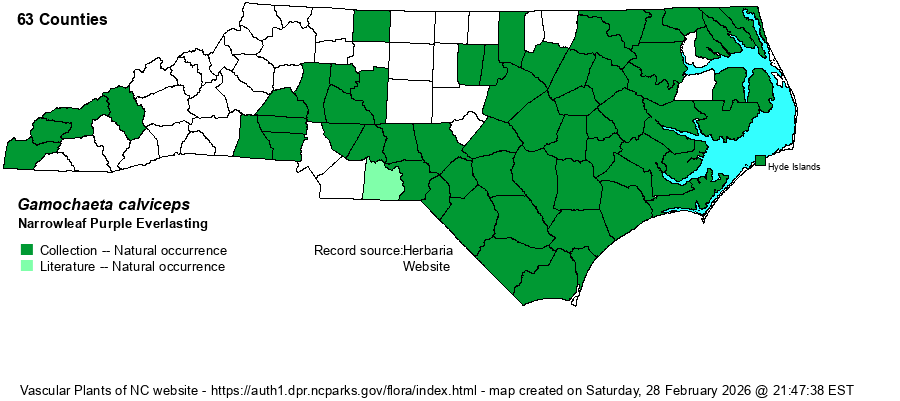 | Identification | Narrowleaf Purple Everlasting is one of several species split off from G. purpurea. G. pensylvanica, antillana, and calviceps all have leaves that are roughly the same color on both sides, due to dense whitish hairs. G. pensylvanica differs by its wider basal leaves (see Weakley 2018) and spatulate bracts among the inflorescence (vs. linear or slightly wider in the others). G. antillana differs by its shorter involucre (overlapping bracts at base and sides of each head) that is 2.5-3 mm long vs. 3-3.5 mm long; also, the involucre is seated in very dense, woolly hairs (vs. sparse to moderate). | |