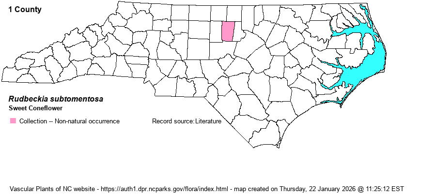 | Distribution | SERNEC contains an 1897 record from Hollow Rock, Orange County, which we tentatively treat as an escaped population. SERNEC records from Wake County are from an arboretum and are thus not mapped.