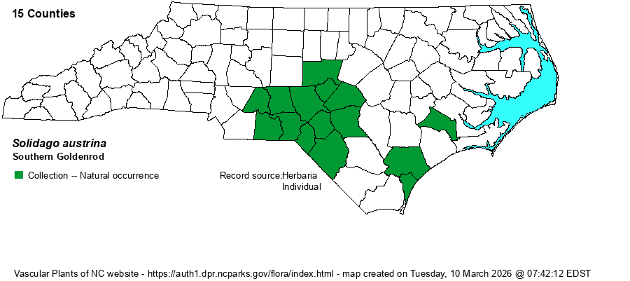 | Distribution | Though this "new" species was split from the old Solidago stricta, as in RAB (1968), in reality it is a split of the newer S. gracillima. However, there is no consensus among botanists that Southern Goldenrod and Graceful Goldenrod (S. gracillima) are truly two distinct species or even varieties. Until the dust settles, it is best to lump the two, with the name S. gracillima having priority. See that name for a full species account. For the record, Weakley (2024) shows S. austrina as occurring in the Piedmont and Coastal Plain, with this species occurring more in "the inner Coastal Plain and lower Piedmont", whereas S. gracillima is present more generically in the Coastal Plain, and not into the Piedmont of NC. To be conservative, the editors have mapped just the specimens in SERNEC at NCU, as hopefully these have been well curated.