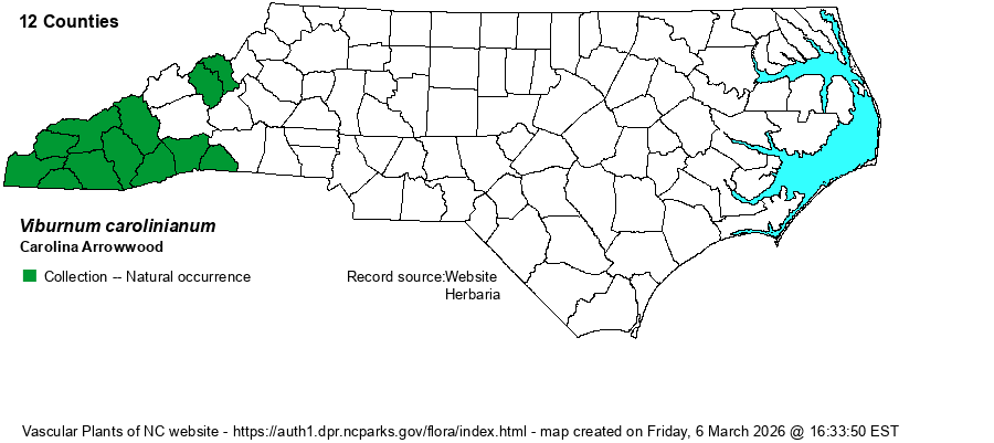 | Distribution | Occurs in the southern Mountains north to Mitchell County, and east into the Piedmont of Polk County. [Note: On the range map in RAB (1968), this species is that portion of “Viburnum dentatum” occurring in the Mountains.]