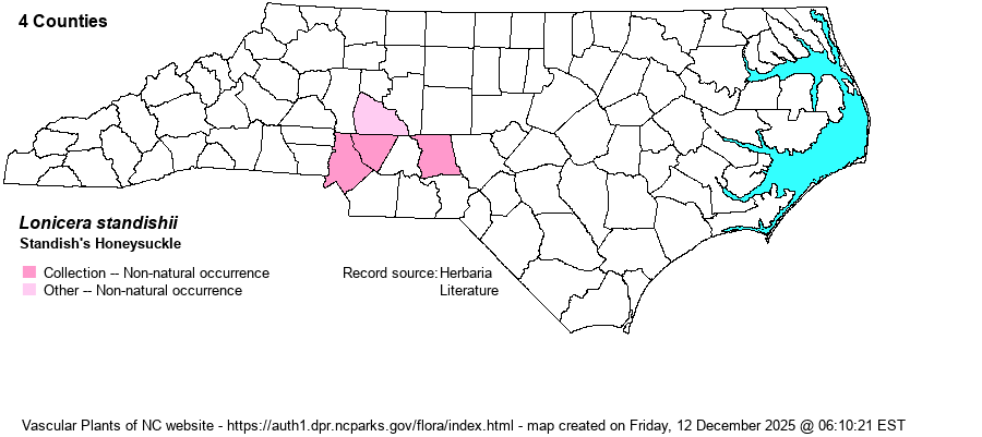| Distribution | Vouchered from 3 Piedmont counties: Mecklenburg County, edge of woods by soccer field, Davidson College, 1964; Cabarrus County, roadside near cemetery, 1998. The Montgomery County specimens were originally determined as L. x bella.