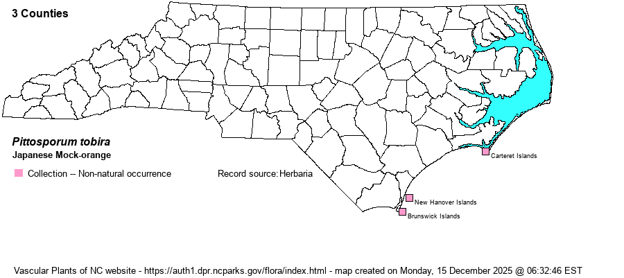 | Identification | Japanese Mock-orange is a tall evergreen shrub or small tree with a broad crown. Weakley (2018) states that the lanceolate to obovate and revolute (margins turned under) leaves are characteristic. The leaves are also thick-textured. The flowers are white, 5-petaled, an dwell-stalked. The fruits are globular and rather woody. | |