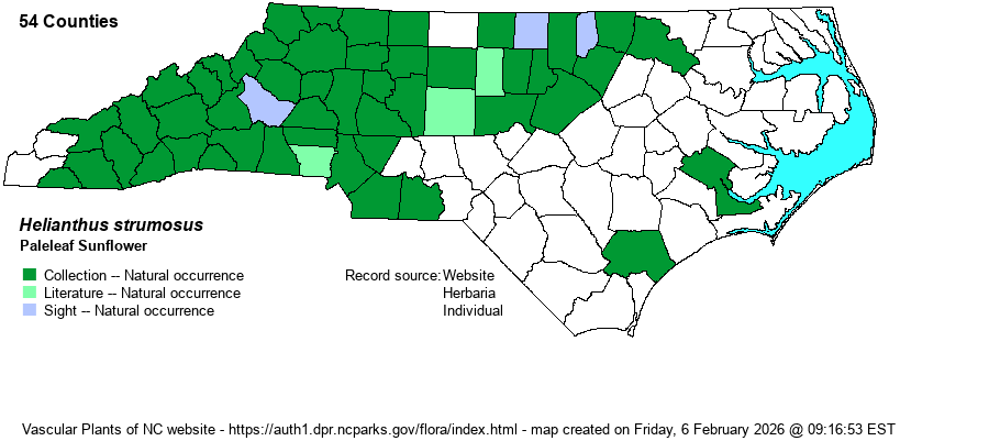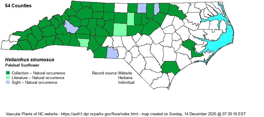| Distribution | Mountains and most of the Piedmont; scarce in the southeastern Piedmont, and disjunct to two counties on the outer Coastal Plain. A number of photos on iNaturalist for "white" counties in the Piedmont may well be correct, but identification of sunflowers from photos is extremely difficult.