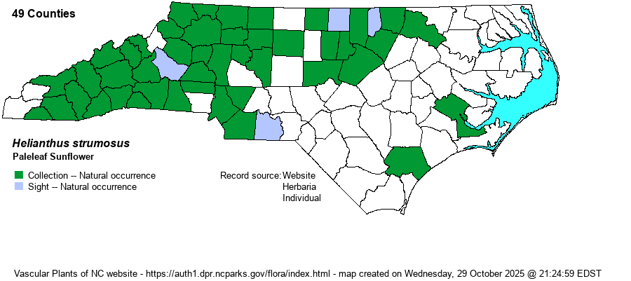 | Distribution | Mountains and most of the Piedmont; scarce in the southeastern Piedmont, and disjunct to two counties on the outer Coastal Plain. a number of photos on iNaturalist for "white" counties in the Piedmont may well be correct, but identification of sunflowers from photos is extremely difficult.