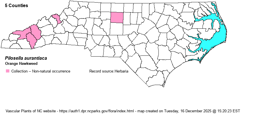 | Pilosella aurantiaca | = | Hieracium aurantiacum | Fernald (1950) | | | Pilosella aurantiaca | = | Hieracium aurantiacum | Flora of North America (1993b, 1997, 2000, 2002a, 2002b, 2003a, 2004b, 2005, 2006a, 2006b, 2006c, 2007a, 2009, 2010) | | | Pilosella aurantiaca | = | Hieracium aurantiacum | Gleason (1952) | | | Pilosella aurantiaca | = | Hieracium aurantiacum | | | | Pilosella aurantiaca | = | Hieracium aurantiacum | Kartesz (1999) | | | Pilosella aurantiaca | = | Hieracium aurantiacum | | | | Pilosella aurantiaca | = | Hieracium aurantiacum | Radford, Ahles, and Bell (1968) | | | Pilosella aurantiaca | = | Hieracium aurantiacum | Vascular Flora of the Southeastern States (Cronquist 1980, Isely 1990) | | | Pilosella aurantiaca | = | Hieracium aurantiacum | Flora of Virginia | | | Pilosella aurantiaca | = | Hieracium aurantiacum | Wofford (1989) | | | Pilosella aurantiaca | = | Hieracium aurantiacum | Wunderlin & Hansen Flora of Florida (3) | | | Pilosella aurantiaca | = | Hieracium aurantiacum | Flora of West Virginia | | | Source: Weakley's Flora |