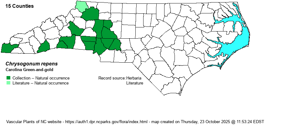 Distribution | Middle and upper Piedmont and the southern Mountains. Our map is taken directly from the papers by Nesom in Sida 19: 811-820, and Phytoneuron 2020-94. Whether this truly represents the actual range in the state is uncertain, considering its recent split from the much more common and widespread C. virginianum. See Taxonomic Comments below.