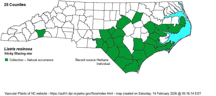 | Taxonomic Comments | Note that the distributions of L. resinosa and L. spicata do not overlap in NC. Weakley (2024) elevates each to full species status, saying of spicata: "Blooming earlier than the coastal L. resinosa, even though occurring inland, more northerly, and at higher elevations".