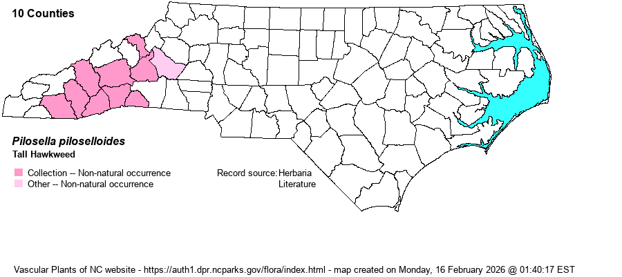 | Pilosella piloselloides | = | Hieracium piloselloides | Gleason and Cronquist (1991) | | | Pilosella piloselloides | = | Hieracium piloselloides | Flora of North America (1993b, 1997, 2000, 2002a, 2002b, 2003a, 2004b, 2005, 2006a, 2006b, 2006c, 2007a, 2009, 2010) | | | Pilosella piloselloides | = | Hieracium piloselloides | | | | Pilosella piloselloides | = | Hieracium piloselloides | | | | Pilosella piloselloides | = | Hieracium piloselloides | Flora of Virginia | | | Pilosella piloselloides | ? | Hieracium florentinum | Gleason (1952) | | | Pilosella piloselloides | ? | Hieracium florentinum | Radford, Ahles, and Bell (1968) | | | Pilosella piloselloides | ? | Hieracium florentinum | Vascular Flora of the Southeastern States (Cronquist 1980, Isely 1990) | | | Pilosella piloselloides | ? | Hieracium florentinum | Wofford (1989) | | | Pilosella piloselloides | > | Hieracium florentinum | Fernald (1950) | | | Pilosella piloselloides | > | Hieracium piloselloides | Kartesz (1999) | | | Pilosella piloselloides | > | Hieracium praealtum var. decipiens | Fernald (1950) | | | Pilosella piloselloides | > | Hieracium praealtum var. decipiens | Kartesz (1999) | | | Source: Weakley's Flora |