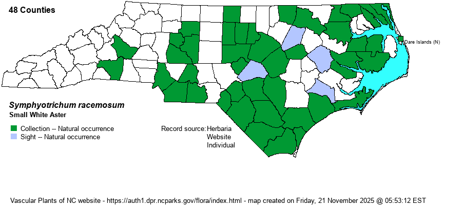 | Distribution | Piedmont and Coastal Plain, rare on the Outer Banks (Roanoke Island); absent from the Sandhills proper. Taxon editors have mapped only specimens labeled S. racemosum and Aster vimineus. There are a number of similar species, and biologists and botanists perhaps simply overlook this reasonably common species; the many holes in the range map are certainty artifacts of collecting.
