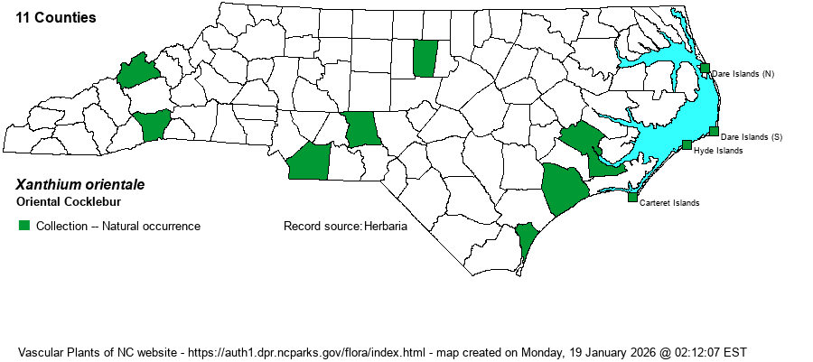 | Taxonomic Comments | See revised nomenclature of this genus in Weakley (2018). NOTE: Plants of the Outer Banks are nearly all Oriental Cocklebur; none of them appear to be the maritime X. echinatum, which Weakley says ranges south to VA.