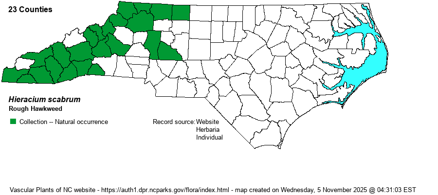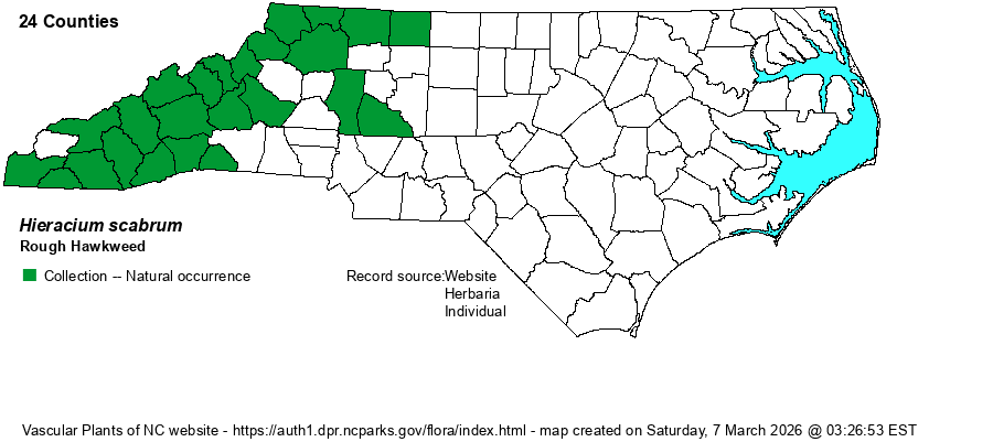 | Identification | Rough Hawkweed is most similar to Beaked Hawkweed (H. gronovii), but its inflorescence is broader than long (vs. cylindrical in outline) and has more florets per head (greater than 40 vs. 20-40). It has more stem leaves than does Beaked Hawkweed, and the basal leaves are usually absent (at flowering time). The most definitive clue is the seed shape: broadest at the tip in Rough Hawkweed, narrowed to the tip in Beaked Hawkweed. This species is less often encountered in the mountains than the other montane species -- Allegheny Hawkweed (H. paniculatum). | |