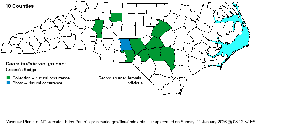 | Taxonomic Comments | Carex bullata has now been dissolved and split into two new entities. Lowland (i.e., Piedmont and Coastal Plain) records of C. bullata are now re-named C. bullata var. greenei. Montane records have been re-named C. bullata var. bullata.