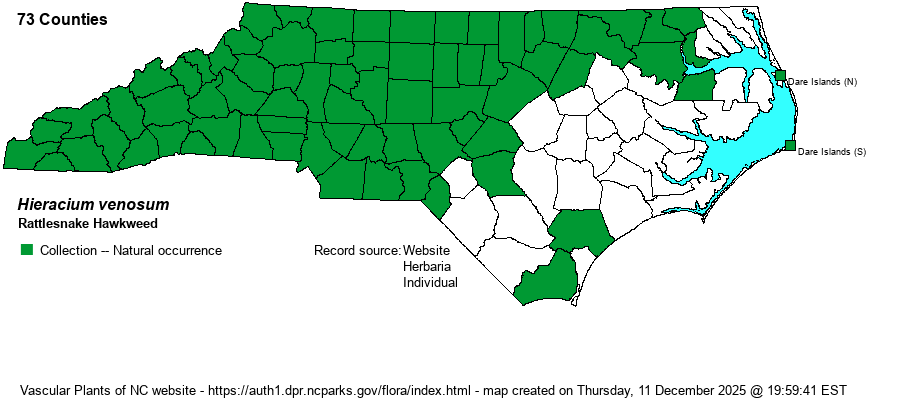 | Identification | With its red-purple (or brown-purple) leaf veins on the basal leaves (in a rosette), near lack of stem leaves, and mostly spring to early summer flowering, Rattlesnake Hawkweed is highly distinct. As with other hawkweeds, the flowers have rays florets only and are yellow in color. However, the flowers are not needed to identify this characteristic plant of dry banks and open, rocky woods. | |