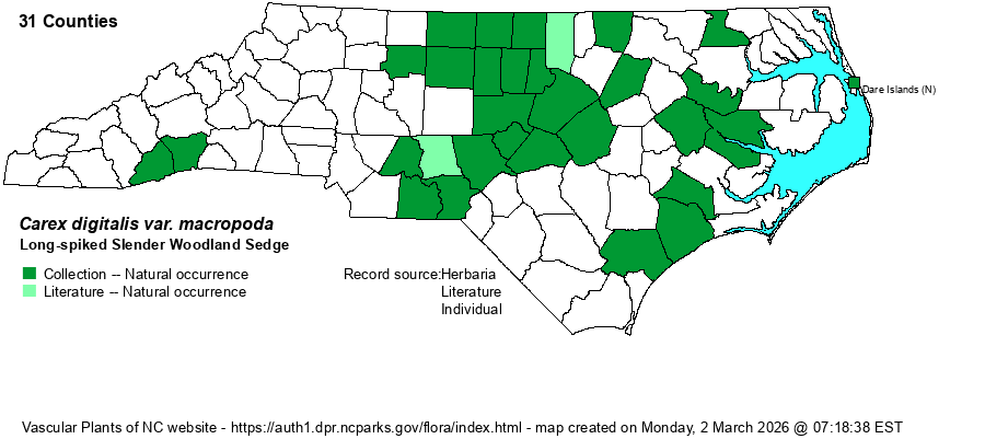 The genus Carex is the largest in North America, and among the largest in the world. In temperate and boreal regions, Carex is often the dominant or co-dominant ground layer in many habitats. Seeds (achenes) are valuable food for birds and small mammals, while foliage is used by birds and mammals to make nests and as food by mammals. Species of Carex often look vastly different from one another -- spikes erect vs. drooping, tiny inflorescence vs. whopping, culms leafy vs. naked, perigynia beaked vs. beakless, stems densely bunched vs. single, etc. The genus has been divided into many sections (or groups), based on shared characters; some taxonomists have suggested that these be different genera, but that proves unworkable (so far). All Carex share the feature of a perigynium (an outer covering) which completely surrounds the achene (seed). This covering may fit tightly or loosely (like a small bladder), depending on which group or species. Details of perigynia shape, ornamentation, presence and size of beak, number of striations (or veins) are all important ID features. In recent years Rob Naczi and colleagues have stressed the importance of arrangement of perigynia -- whether spiral (3+ ranks) or distichous (2-ranked) -- and have named a number of new species as well as split off some older synonyms. Therefore, RAB's (1968) key, excellent for its time, can only be used in a general way today. Members of some sections of Carex are difficult to key out (notably Ovales, Laxiflorae, Griseae); this is in part due to variation among individuals of a species, or failings of the key. FNA has drawings of most species and some species may be found in two or more places within a key, to acount for variability. New species to NC, and new to science(!), continue to be found in NC. | |