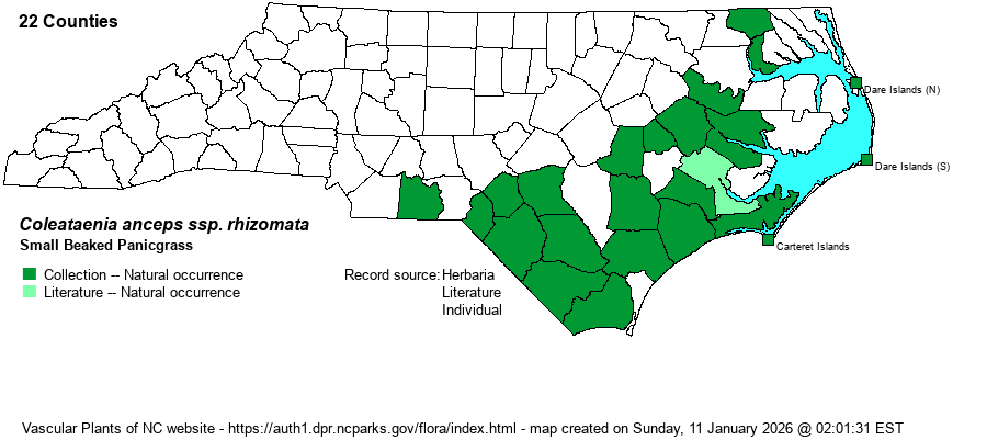 | Coleataenia anceps ssp. rhizomata | = | Panicum anceps var. rhizomatum | Weakley et al. (2011)=U. | |