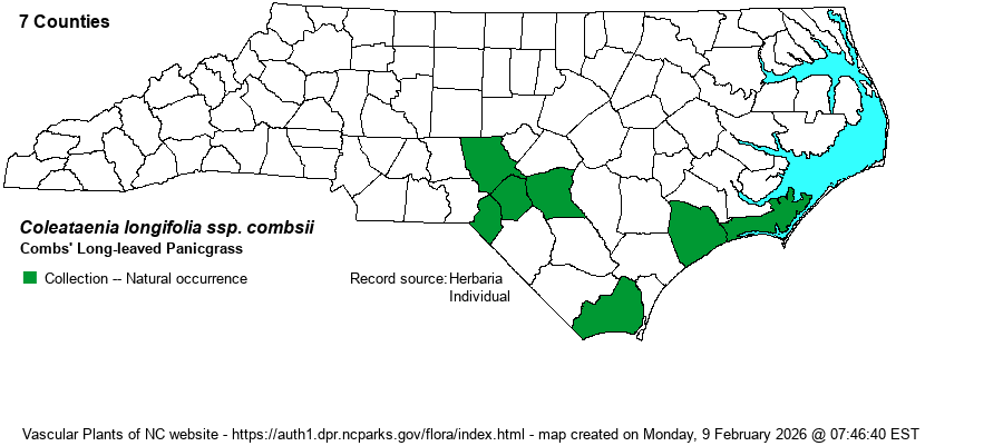 | Coleataenia longifolia ssp. combsii | = | Panicum combsii | Hitchcock & Chase (Manual of US Grasses) | |