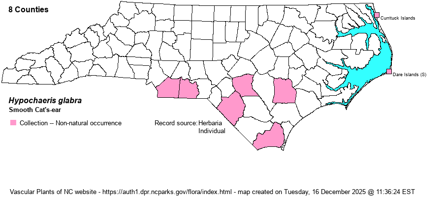 | Identification | Smooth Cat's-ear has glabrous or glabrate basal rosette leaves (vs. hispid-hairy basal leaves in the quite common H. radicata). | |