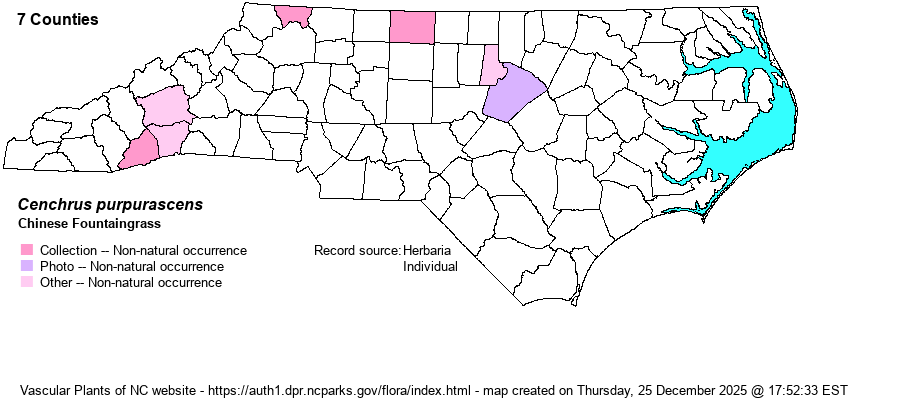 | Identification | This is a very large and robust sandspur, more closely related to C. americanus than to our other species. But unlike that species, C. purpurascens has long, dark brown bristles. | |