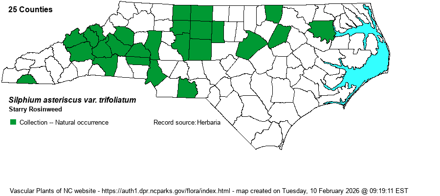 | Identification | The Silphium asteriscus complex consists of 5 varieties, according to FNA and Weakley, three of which occur in NC. Plants grow mostly 3-5 feet tall, with lance-shaped to ovate leaves and a rather small inflorescence of nearly erect branches terminating in yellow heads. Basal leaves are absent at flowering time. The involucral bracts (at the base of each head) are broad, rounded, and thick-textured; thus they differ strongly from bracts of sunflowers (Helianthus). Variety asteriscus and var. dentatum have rough surfaces to leaves, vs. smooth in var. trifoliatum and latifolium. Leaves of the former are mostly whorled (3-4 at each node) vs. mostly opposite in the latter. | |