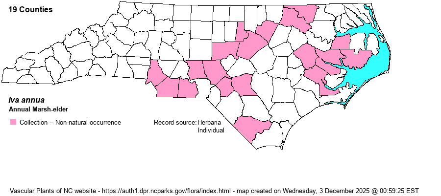 | Identification | This species of Iva grows 2-4 feet (or more) tall. The leaves are opposite, ovate, and sharply toothed. Like others in the genus, its heads grow in dense, linear spike-like inflorescences, strongly vertically aligned. It differs in the combination of opposite, toothed leaves that are not dissected. | |