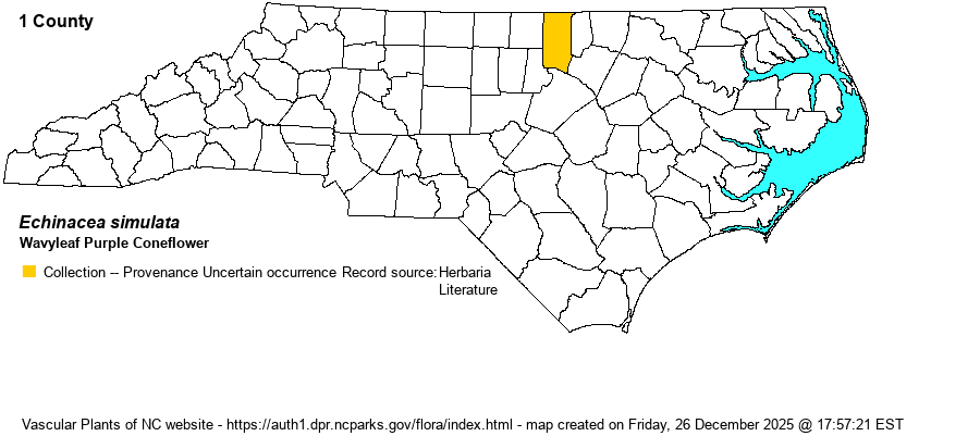 | Distribution | The only specimens at SERNEC are from a roadside near Butner in Granville County. This population has formerly been considered for several decades as E. pallida, but Weakley (2024) now states that the specimens in the eastern Piedmont for E. pallida are likely to be E. simulata (see below).