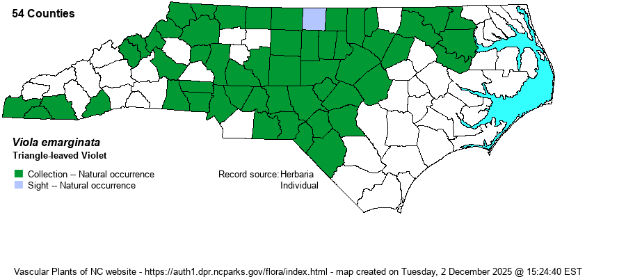 | Distribution | A species with a checkered past, varying from species (as in RAB [1968]) to fully lumped, or treated as a hybrid between V. sagittata and some other species. Weakley (2018) included this within V. sagittata, but his 2020 version has it split back out again. SERNEC has a large number of specimens annotated to V. emarginata, but others are likely still included under V. sagittata. The current map reflects mostly specimens at NCU that were annotated in July 2024 by Harvey Ballard. There are certainly other correctly identified specimens at other herbaria, but which have not been verified by Ballard. Weakley (2024) now shows FOUR varieties of this species! This website will not even begin to go that far to include these varieties, three of which are undescribed.