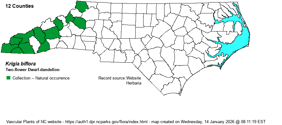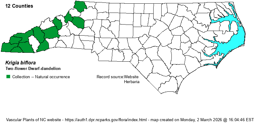 | Distribution | Mountains only. Specimens at NCU from Chatham County, determined as biflora, actually are K. caespitosa.