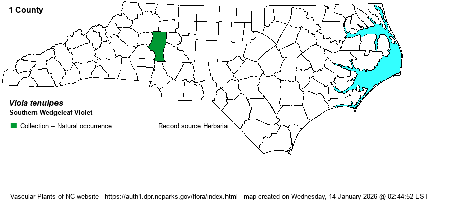 | Distribution | Supposedly present in the southern portions of the Mountains and Piedmont, but specimens apparently have yet to be annotated; currently all(?) herbaria list this species within V. tripartita var. glaberrima, or within V. glaberrima. Thus, this website can provide no map of county records at the present time. This is a new and likely controversial split, included in Weakley (2020); SERNEC now lists one record -- for Iredell County.
