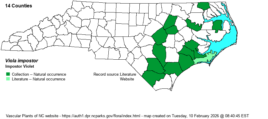 | Abundance | Weakley's (2024) map shows it as rare in NC. The website editors suggest S2? for now, based on collections from 13 counties, and Watch List status, owing to it being a newly described species and perhaps an overlooked taxon at that, being likely confused in NC with V. affinis or V. cucullata. | |