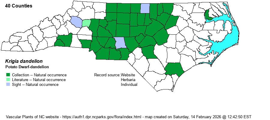 | Habitat | Mesic to moist soils of pine-deciduous woodlands, open hardwoods, rocky slopes, openings, roadsides, and weedy fields. As with the other non-montane Krigia species, it is usually seen in full sun in disturbed places. |
